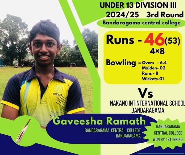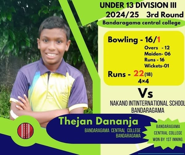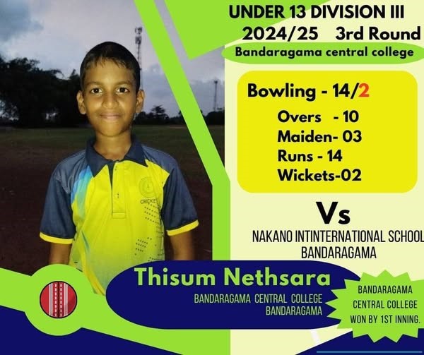 බණ්ඩාරගම මැදි විදුහල් 13න් පහල ක්රිකට් කණ්ඩායම සහ බණ්ඩාරගම නකානෝ ජාත්යන්තර පාසල් ක්රිකට් කණ්ඩායම අතර පැවති තෙවන වටයේ ක්රිකට් තරගයෙන් පලමු ඉනිමේ ජයක් ලබා ගනිමින් ශ්රී ලංකාවේ අවසන් පාසල් 128 අතරට පිවිසීමට බණ්ඩාරගම මැදි විදුහල් ක්රීඩකයන් සමත් විය. නායක සේමික තසිත් විශිෂ්ඨ අර්ධ ශතකයක් ලබා ගනිමින් තම කණ්ඩායම ජයග්රාහී මාවතට රැගෙන යනු ලැබීය. එම පුතුන්ට සමස්ත විද්යාලයීය සුබ පැතුම් පිරිනමමු!