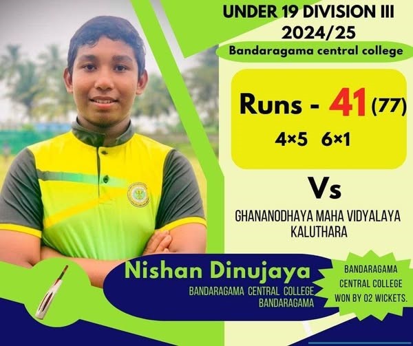 බණ්ඩාරගම මැදි විදුහල් 19න් පහල ක්රිකට් කණ්ඩායම සහ ප්රබල කලුතර ඥානෝදය පාසල් ක්රිකට් කණ්ඩායම අතර පැවති වයස අවුරුදු 19 න් පහල ක්රිකට් තරගයෙන් කඩුලු 2 ක තියුණු ජයක් ලැබූ බණ්ඩාරගම මැදි විදුහල් ක්රීඩකයෝ මෙවර තරගාවලියේ පිට පිටම දෙවන ජයග්රහණය වාර්තා කරන්නට සමත් වූ අතර නායක සංජන ඩිලංක හා නිශාන් දිනුජය විශිෂ්ඨ පිතිහරඹයක නිරතවෙන්නට සමත්විය. එම පුතුන්ට සමස්ත විද්යාලයීය උණුසුම් සුබ පැතුම් පිරිනමමු .ක්රිකට් ක්රීඩාව භාර ගුරුභවතුන්ටද ,අප විද්යාලයීය ක්රිකට් ක්රීඩා පුහුණුකරුවන්ටද සමස්ත ක්රීඩා අංශයටද විද්යාලයීය ස්තූතිය පිරිනමමු.